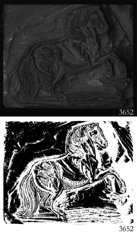 Woodblock for printing an illustration of a horse. |