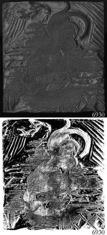 Woodblock for printing an illustration of a rooster. |