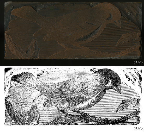 Electrotype for printing an illustration of an unidentified bird, possibly a finch. |