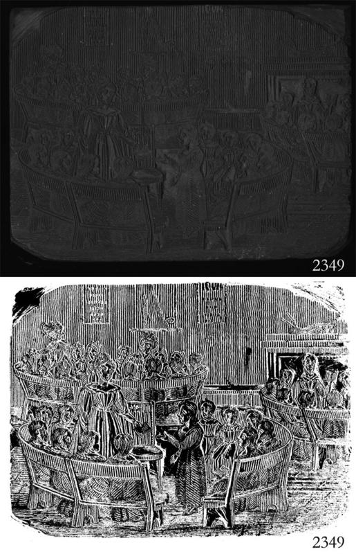 Image of a classroom or other social scene [?] Quill pens and books are on a table in the background. Posters and map [?]
