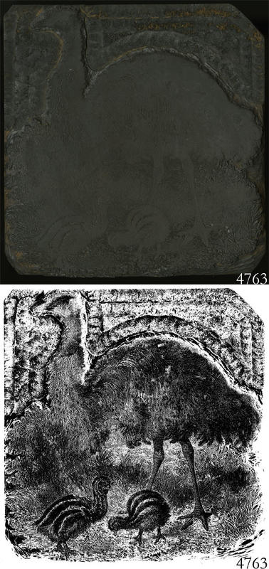 Woodblock for printing an illustration of ostriches. |