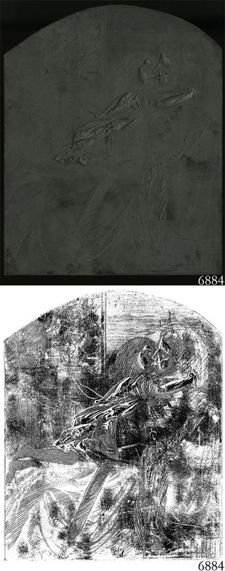 Woodblock for printing an illustration of an adult and child. |
