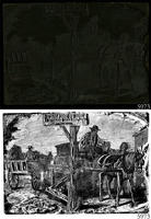 Woodblock for printing an illustration of two horse-drawn carriages. |