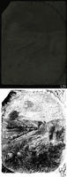 appears to be a distant church, while the third man brings two horses toward his companions.