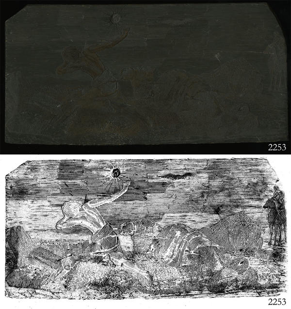 Woodblock for printing an illustration of men and camels. |