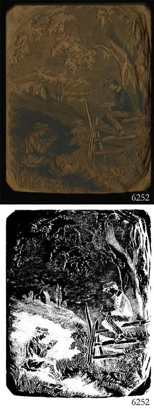 “Sunshine & Shadow To…[unintelligible] Chap 1st Vignette” -- inscribed on side of block. |