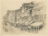 Reproduction of a drawing depicting a row of stores with awnings on Chestnut Street. Pedestrians are present on both sides of the street, and horse-drawn carriages and wagons are present.