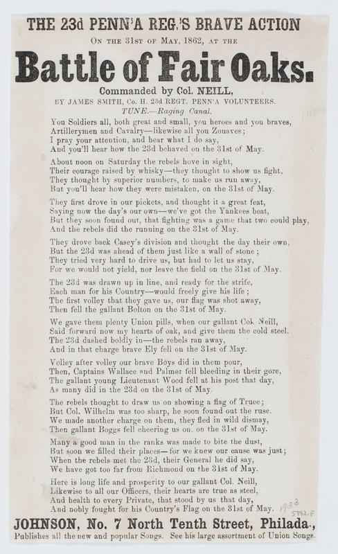 d. Title: "Fair Oaks Battle, Fought on the 31st of May 1862"; respectfully dedicated to the Gallant 23d Pa. Regt. Commanded by Col. Neill; [publ.] Johnson (2). 24.2 x 12.2 cm.