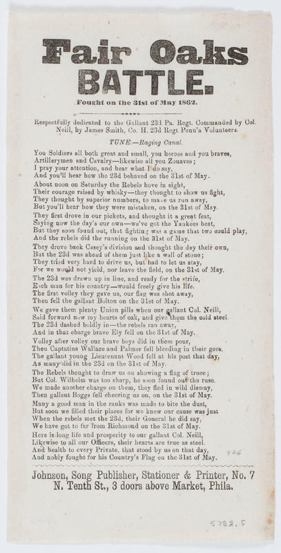 d. Title: "Fair Oaks Battle, Fought on the 31st of May 1862"; respectfully dedicated to the Gallant 23d Pa. Regt. Commanded by Col. Neill; [publ.] Johnson (2). 24.2 x 12.2 cm.