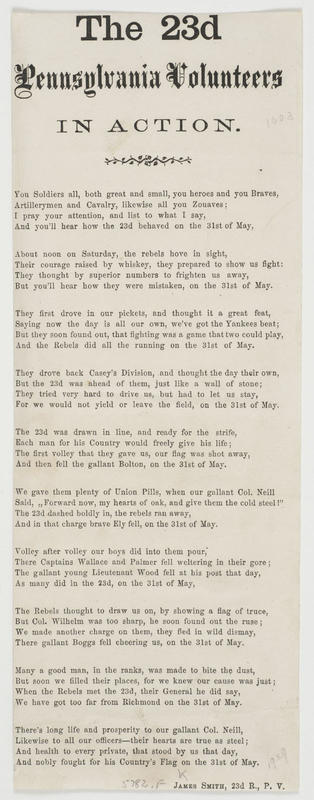 d. Title: "Fair Oaks Battle, Fought on the 31st of May 1862"; respectfully dedicated to the Gallant 23d Pa. Regt. Commanded by Col. Neill; [publ.] Johnson (2). 24.2 x 12.2 cm.