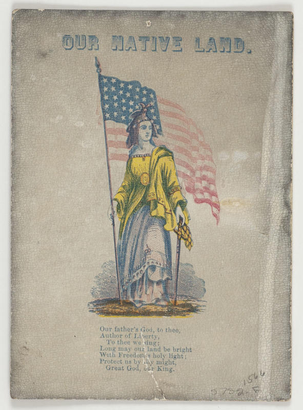 j. Title: "Our Native Land"; 3d vs. only. Card; blue ink; figure of Columbia with flag, col. 11.2 x 8 cm.