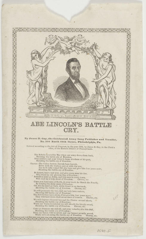 a. By James D. Gay, the Celebrated Army Song Publisher and Vocalist. T. o. border; bust of Lincoln in ornamental frame. 24.4 x 15 cm.