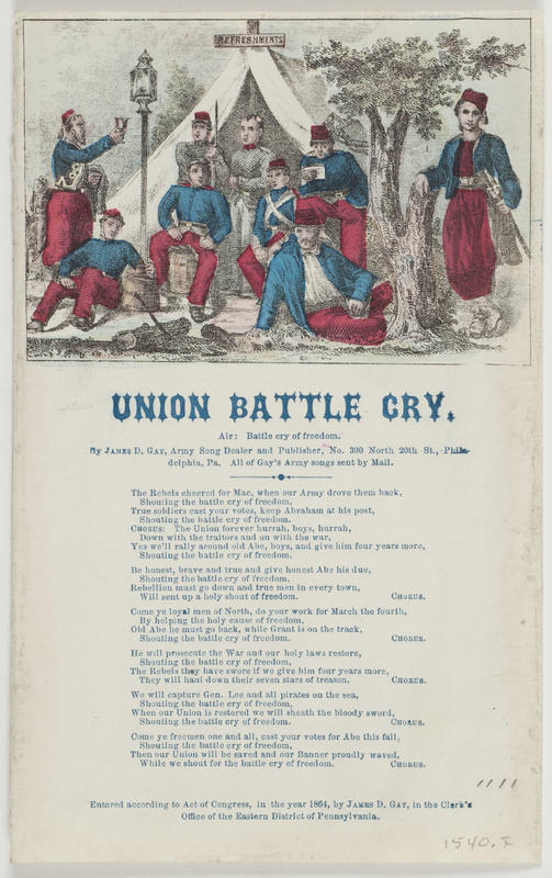 b. Title: "Union Battle Cry"; by James D. Gay, Army Song Dealer and Publisher; Air: Battle cry of freedom; adv: Gay's Army songs sent by Mail. Letter paper; blue ink; hdpc. Magnus 176, col. 20.3 x 12.4 cm.