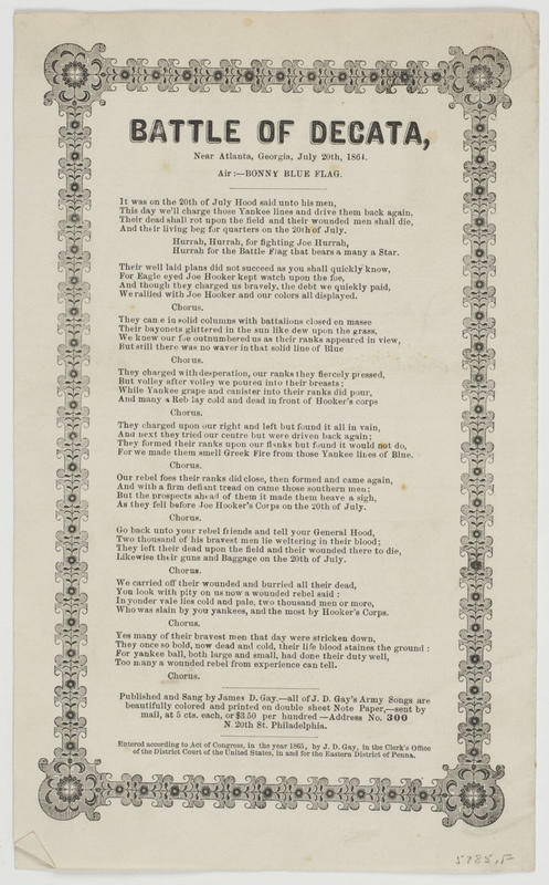 b. Title: "Battle of Decatur, or Peach Tree Creek, near Atlanta, Ga., fought by Joe Hooker's Corps, July 20, 1864"; with quotes around Air; [without 9th vs.;] 2 chors.; short lines; published and sung by James D. Gay; cop: 1865, James D. Gay, EDPa. Single