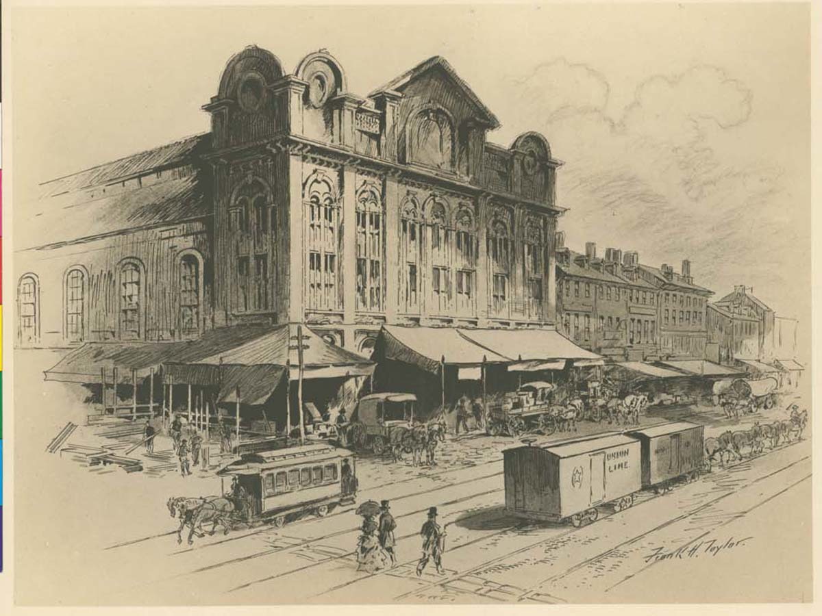 Reproduction of a drawing of the Farmers' Market House and nearby buildings. Awnings cover the ground level of the market, while pedestrians, a horse-drawn streetcar, and two freight cars are in the foreground.