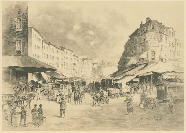 From the early days of the city those who prospered began to build spacious houses along the nether shores of Dock Creek where its twin affluents, winding through wildwood groves, met and formed a haven. Their gardens were spread along its slopes, gracing a scene of sylvan beauty, but there came a time whenpestilence spread from the polluted stream and, at great cost, Dock Creek was roofed by a pavement and this broad winding space became and has since remained our greatest provision mart, affording busy and always picturesque vistas of which this scene is typical. Dock Street is an arena of the never-ending battle between plenty and hunger. The vital business of fetching and distribution is Dock Street's one big occupation by night and day. If Dock Street ever sleeps it is just for a few hours on a Sunday.