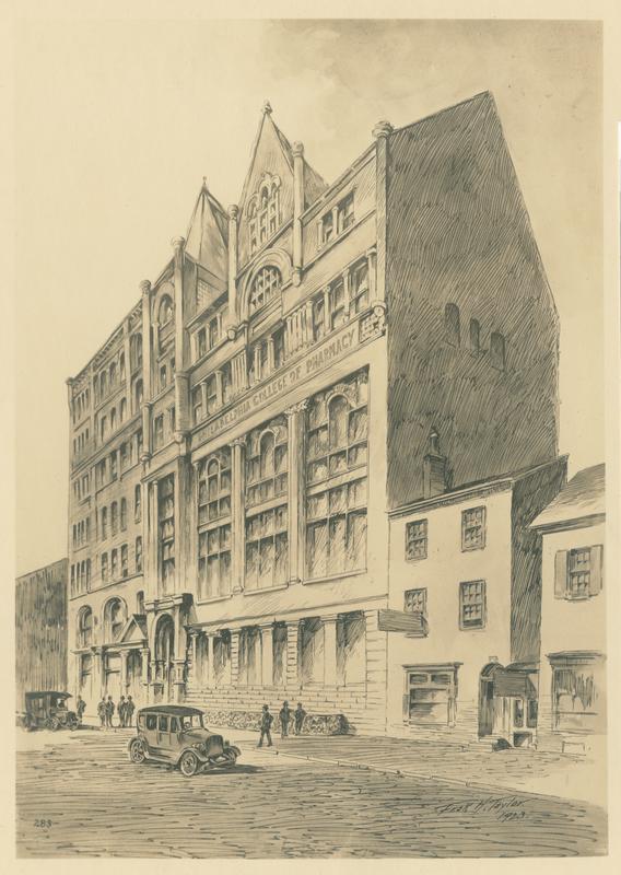 Reproduction of a drawing that depicts a building with a sign reading "Philadelphia College of Pharmacy." Pedestrians walk
