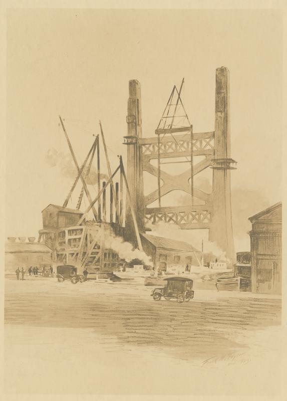 Reproduction of a drawing depicting the construction of a bridge tower. Figures work near the scaffolding clustered around the left-hand side of the tower, and automobiles are in the foreground.