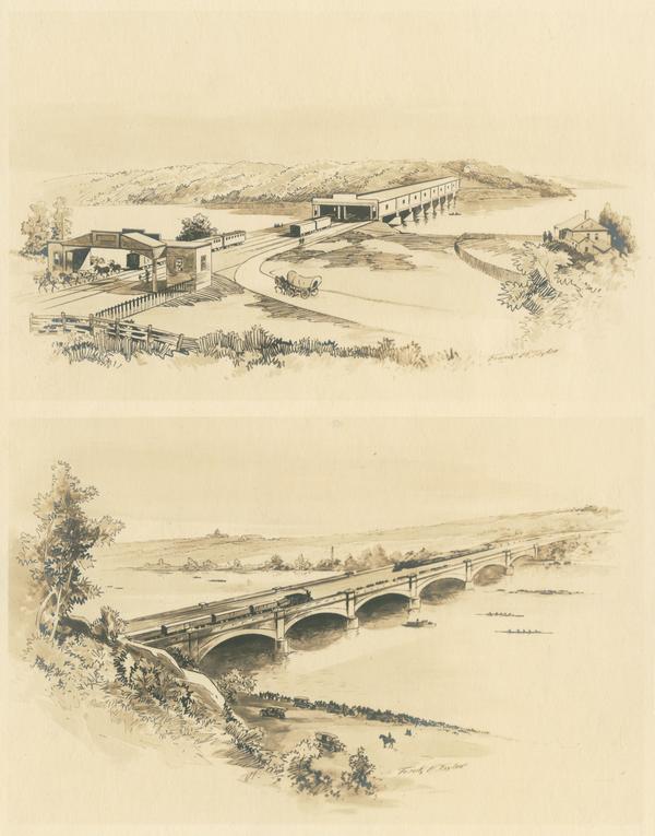 Reproduction of two drawings depicting a bridge over a river. Top image depicts a covered railroad bridge with a train going across, with a horse-drawn covered wagon and a train car pulled by mules in the foreground. The bottom image shows an uncovered bridge with two steam locomotives moving in opposite directions, and two automobiles and horses on the lower bank of the river.