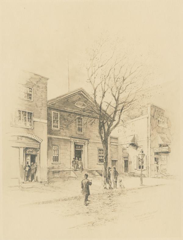 The German Society, formed for teh assistance of newcomers from the fatherland, was organized in 1764. Its meetings were held for a dozen years in the building of the German Lutheran School on Cherry street, east from Fourth street. The Society was incorporated in 1781 and built, at that period, a substantial structure on Seventh street, a part of which was reserved for a library and reading rooms. Wings were added in 1841. The city leased the main structure in 1866 for offices of the gas works. Subsequently a new front was extended to the street line. The Builders' Exchange bought the property in 1893 and made radical alterations, including the construction of an office arcade upon the gorund covered by the original building. The German Society is now located (1915) at Marshall and Spring Garden Streets.