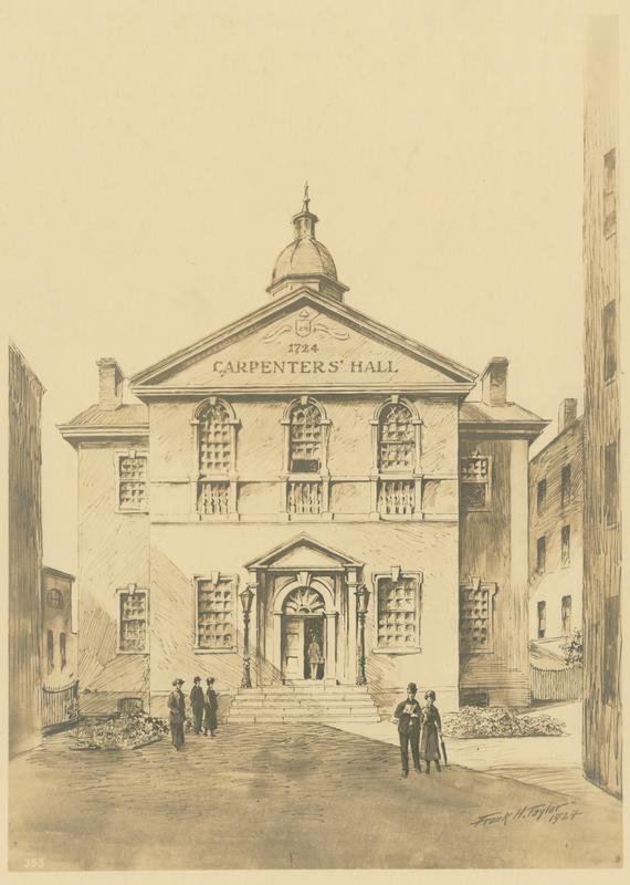 Reproduction of a drawing depicting a building with the sinage "1724 Carpenters' Hall." Figures walk and converse in the courtyard