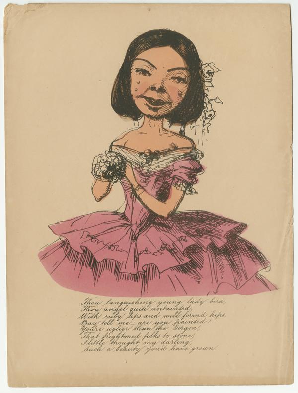 Text: Thou languishing young lady bird, / Thou angel quite untainted, / With ruby lips and well formed hips, / Pray tell me – are you painted! / You’re uglier than the Gorgon, / That hightoned folks to stone, / I little thought my darling, / Such a beauty you’d have grown.
