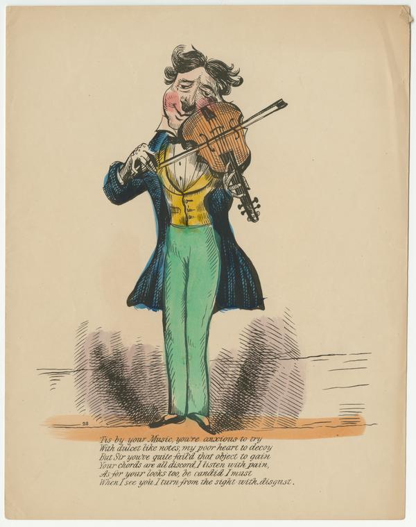 Text: ‘Tis by your Music, you’re anxious to try / With dulcet like notes, my poor heart to decoy / But Sir you’ve quite fail’d that object to gain / Your chords are all discord, I listen with pain, / As for your looks too, be candid I must / When I see you I turn from the sight with disgust.