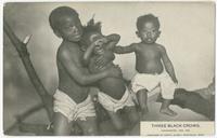 Racist, satiric postcard depicting three young African American boys perched from oldest to youngest on a branch as "Black crows." The boys are attired in loin clothes. The middle child is crying with his hands over his eyes and falling off the branch. In the left, the oldest boy attempts to hold him up. The youngest, a baby, pats the middle child's shoulder with his right hand.