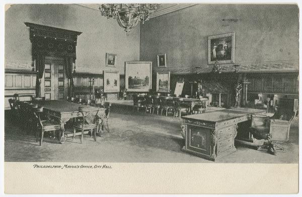 Contains views of City Hall built 1871-1901 after designs by John McArthur Jr. Includes several exterior views of the building, showing construction of the tower looking west on Market Street; the completed building and tower from 15th and Arch Streets and another from North Broad Street looking south. Also depicts an interior view of the Mayor's office.