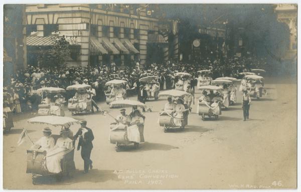 Contains commemorative postcards for the Elks Convention, the 21st annual reunion of the Benevolent and Protective Order of Elks (B.P.O.E.) held in Philadelphia in 1907. Includes views of Strawbridge and Clothier decorated with pennants, the Court of Honor on Broad Street looking north toward City Hall tower and a procession of Atlantic City roller chairs.
