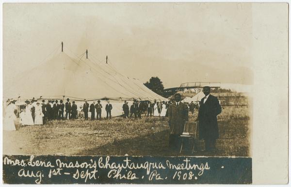Postcard showing an African American Chautauqua meeting. Depicts African American men, women, and children gathered near several tents. In the foreground, an African American woman and man, possibly Mrs. and Mr. Mason, stand and look at the viewer next to a wooden chair with a hat on top of it. Chautauqua meetings, developed from the Lyceum Movement, were traveling tent shows providing education and entertainment to early 20th-century audiences.