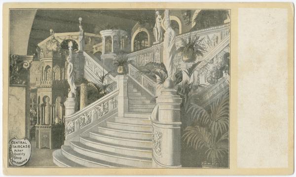 Primarily includes interior views of Acker Quality Shop showing various departments and restaurants. Depicts the confectionary department, Caillers Swiss Chalet, the Men's Dutch Kitchen and the refreshment fountain. Also includes views of the central staircase and the front and east facades.