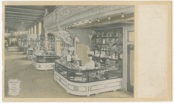 Primarily includes interior views of Acker Quality Shop showing various departments and restaurants. Depicts the confectionary department, Caillers Swiss Chalet, the Men's Dutch Kitchen and the refreshment fountain. Also includes views of the central staircase and the front and east facades.
