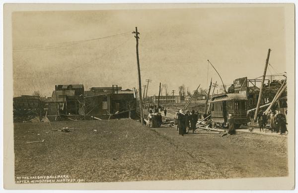 Depicts damage after windstorm in Tacony Ballpark showing poles toppled over and tilting, debris scattered and remains of an unidentified structure near a streetcar. Also includes people assessing damage.