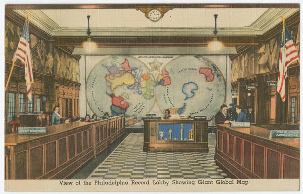Depicts interior views of the Philadelphia Record building on Chestnut Street, including the lobby showing a giant global map and a printing room during Franklin's time. Constructed in 1886 after designs by Willis Gaylord Hale.