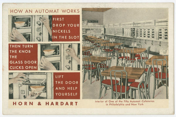 Contains images of Horn & Hardart's Automat at 818-820 Chestnut Street, one of the largest of 50 automats operated by the company in the Philadelphia and New York areas in the first half of the 20th century. Opened circa 1902. Depicts interior views of the electric order section, main dining area and customer's helping themselves to coffee. Also includes illustrated instructions that show how an automat works. The automat closed in 1968 and was given to the Smithsonian Museum of American History.