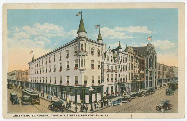 Contains images of Green's Hotel at the northeast corner of 8th and Chestnut Streets. Depicts an exterior view looking northeast and interior views of the writing and smoking room, dining room, tea room, the lobby and writing room. Also includes an advertisement for the hotel, with an inset of the exterior of the hotel building. Places of interest in Philadelphia printed on verso of advertisement.