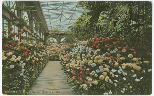 Depicts hall built 1875 after designs by Hermann J. Schwarzmann, demolished in 1955 even though the 383' long, 193' wide building was supposed to remain a permanent botanical conservatory, showcasing exotic plant species and Victorian gardens. Includes exterior views of front facade and flank and interior views of chrysanthemums, a palm exhibit, a fern house, a cactus bed and the entrance of the hall. Also depicts various views of the Sunken Gardens and the Lily Pond.