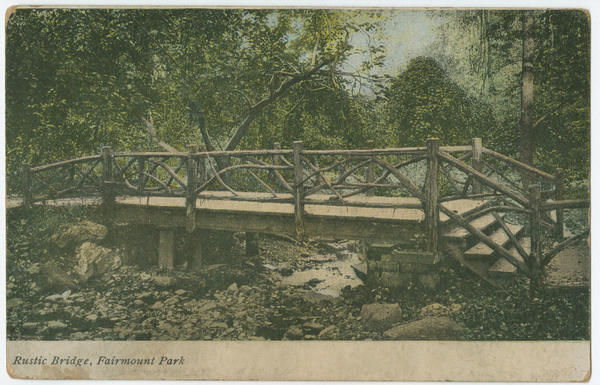 Depicts a wooden pedestrian bridge over a stream in Fairmount Park. Identified as the "Rustic Bridge" on two postcards and as the "Bridge in Glen" on the other.
