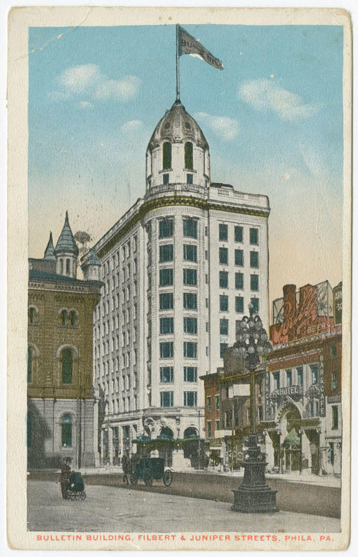 Contains exterior views of the office building of the Philadelphia newspaper, the Evening Bulletin, built 1906-1908 after designs by Edgar Viguers Seeler.