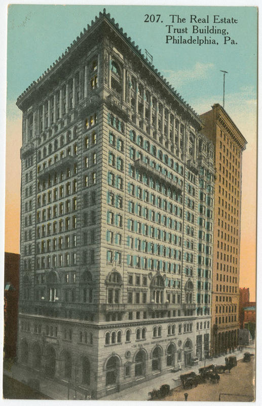 Depicts the Real Estate Title & Trust Company built 1897-1898 after designs by Edgar Viguers Seeler. Includes views of the Betz Building, Girard Trust Company and the North American building in the background.