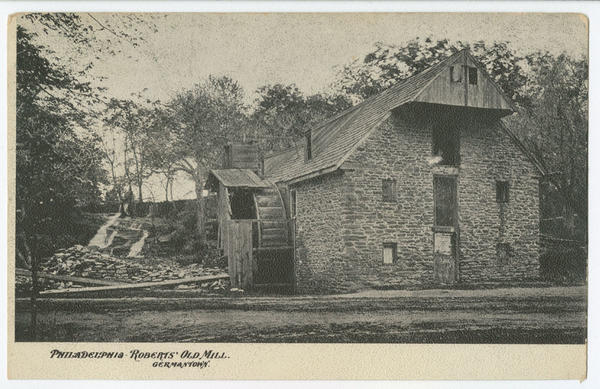 View of old grist mill showing wheelhouse and waterfall, built by Richard Townsend in 1683 on Mill Street (Church Lane) and Wingohocking Street. Considered the oldest mill in Pennsylvania. Later it was known as Lukens Mill and then Roberts Mill after its 19th century owner, Hugh Roberts. Demolished circa 1873.