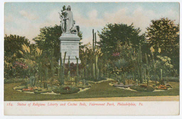 Depicts the statue of Religious Liberty symbolized by a classical figure wearing a cap with a border of thirteen stars representing the Colonies. She holds the Constitution of the United States in her left hand and raises her right hand above Faith, represented by a youthful figure holding the lamp of Religion. Designed by Moses Jacob Ezekiel in 1876 in honor of the Centennial anniversary. Also includes views of the cactus beds surrounding the base of the monument.
