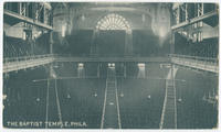 Contains exterior views of Baptist Temple at North Broad and Berks Streets built in 1889 after designs by Thomas Preston Lonsdale. Also includes an interior view of the pews and balcony looking from the pulpit to the main entrance.