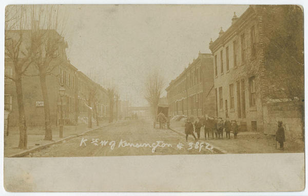 Depicts row homes on K Street west of Kensington Avenue. Includes a sign for H. Trochler, florist, and several school children posing for the picture.