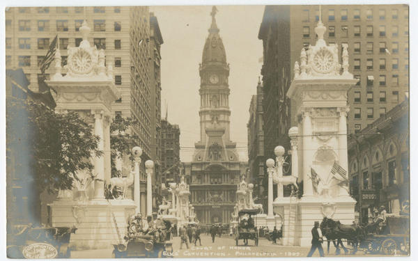 Contains commemorative postcards and advertisements for the Elks Convention, the 21st annual reunion of the Benevolent and Protective Order of Elks (B.P.O.E.) held in Philadelphia in 1907. Depicts elk on every postcard; City Hall tower; William Penn; clocks striking eleven o'clock in the evening; the Court of Honor showing City Hall in the distance; the Quien Sabe Club of El Paso, Texas marching in the procession and an unidentified street view showing buildings and street posts ornamented with pennants. Also includes views of specific buildings like Carpenter's Hall; Horticultural Hall; Independence Hall; City Hall; the Liberty Bell; Wanamaker's store; Strawbridge and Clothier; Lit Brothers store; the North American building and the Ladies' Reception headquarters.