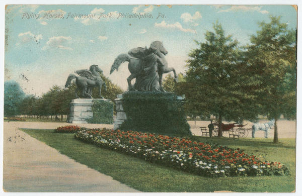 Depicts statue of Pegasus as two winged horses flanking the drive leading up to Memorial Hall in Fairmount Park. Designed by Vincenz Bildhauer Pilz in 1863.