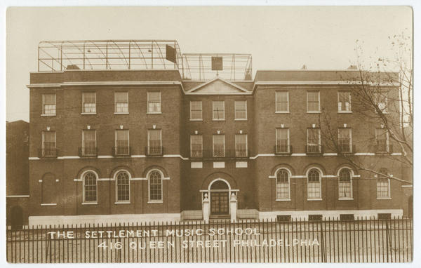 Exterior view of the front facade of the Settlement Music School. Includes a view of a party at the school, with a policeman wearing a basket hat in the foreground.