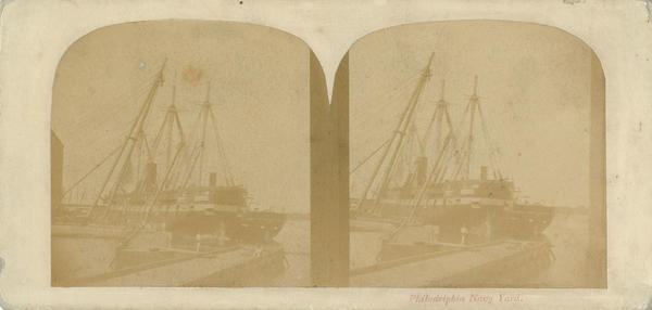 Manuscript note in modern hand on verso: Old Ironsides. U.S.S. Constitution. Idenitifcation is likley incorrect given design of ship and U.S.S. Constitution did not dock at the Philadelphia Navy Yard in the 1850s, but circa 1873 for renovations for the Centennial Exhibiton of 1876.