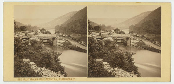 Landscape view showing canal locks on the Juniata River in a mountain pass known as "Jack's Narrows". Tree-covered mountains, part of the Allegheny Mountain chain, flank the winding river.